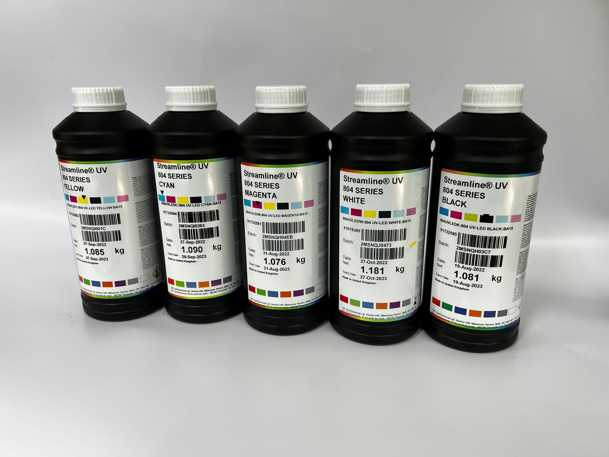 Atramenty UV LED firmy Sunchemical serii 804, 803 są dedykowanym rozwiązaniem dla głowic Ricoh Gen 5/6 oraz głowic Konica Minolta 1024i. Atramenty zapewniają stabilność wydruku, wytrzymałość na załamania oraz doskonałe krycie bieli. Sunchemical to przede wszystkim gwarancja bardzo wysokiej jakości produktu. Dostępne kolory CMYK LcLm plus White. Opakowania 1000ml.